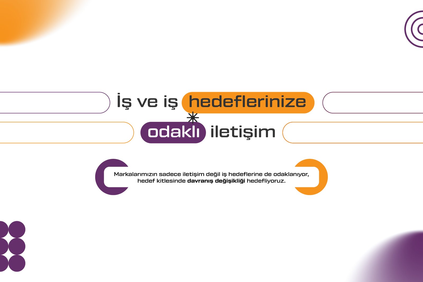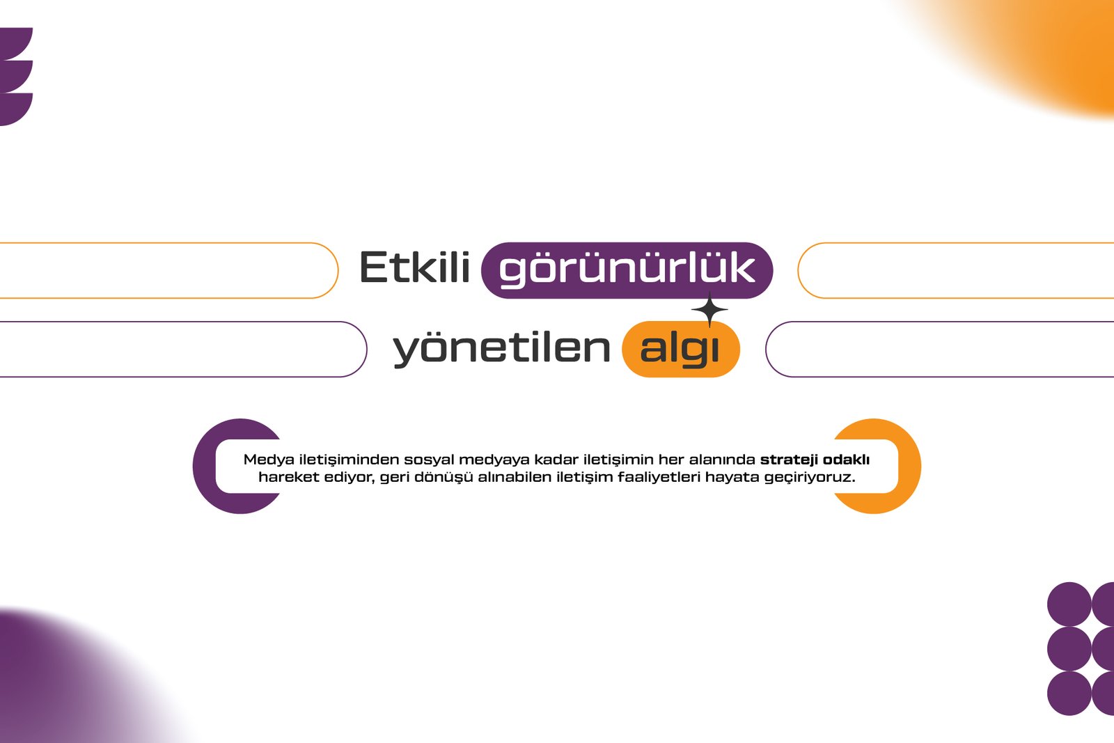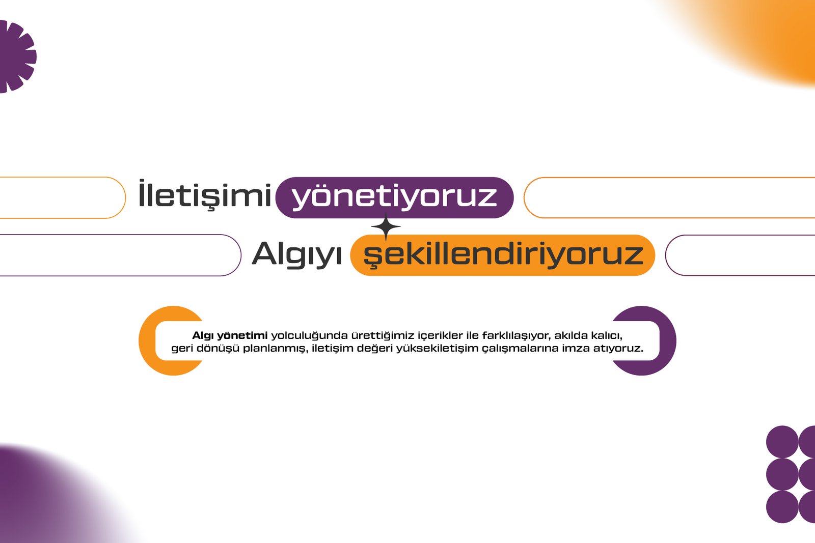 Markalarımızın iş ve iletişim hedeflerinize odaklanıyor, etkili içerik üretmeyi merkeze alıyoruz. Her detayı planlanmış iletişim araçları ile markalarımızı hedef kitle ve paydaşları ile buluşturuyor, davranış değişikliği hedefliyoruz. Algı ve İtibar Yönetimi, Medya İletişimi, Lider İletişim, Marka ve Ürün İletişimi, Konu ve Gündem Yönetimi, Pazarlama İletişimi, İç İletişim ve Kriz Yönetimine alanlarında iletişim stratejisini oluşturuyor, planlıyor ve uyguluyoruz.